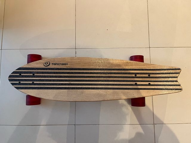 Detalles del productoSkate de madera con un diseño clásico y ruedas de color rojo vibrante. Perfecto para paseos y trucos.