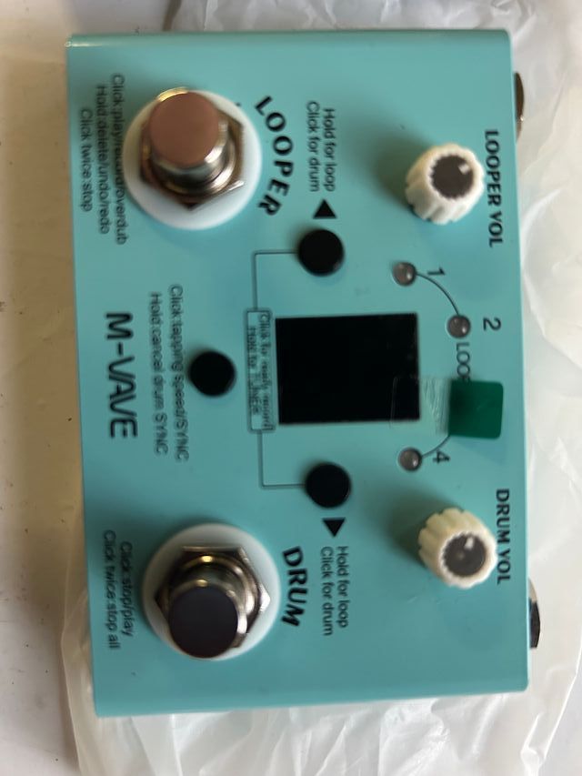 Pedal de efectos M-Wave con funciones de looper y drum machine. Color azul. - Controles de volumen para Looper y Drum. - Botones de función para Looper y Drum. - Pantalla digital.