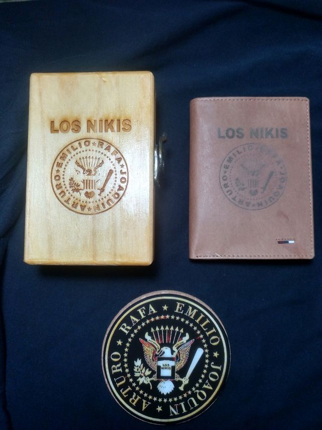 Detalles del productocaja de madera de 13 x 8 x 5 grabado con el logo del grupo Los Nikis + cartera de piel y de regalo el posavasos y un llavero de la foto