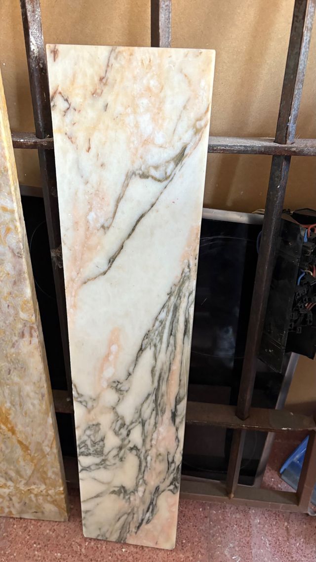 Pieza de mármol con vetas rosadas y grises sobre fondo blanco. Su diseño es único y llamativo. - Material: Mármol. - Color: Blanco con vetas rosas y grises.