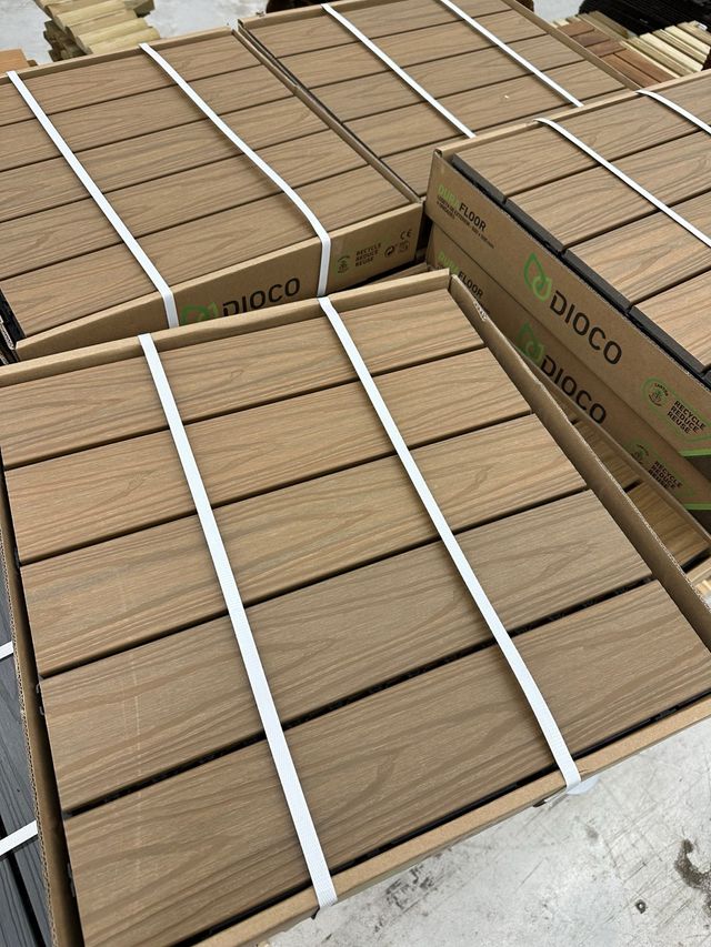 Dos baldosas sueltas de composite en color marrón, marca Dioco (Leroy Merlín). En tienda solo se venden en packs de 4. Nosotros solo necesitamos 2.