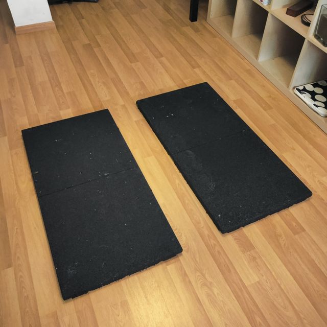 Detalles del productoCuatro losetas de caucho con dos meses de uso en interior de domicilio para entrenamiento con pesas. Prácticamente nuevas. Cada una mide 1 x 0'5 metros, con 4 centímetros de grosor. Medidas del producto