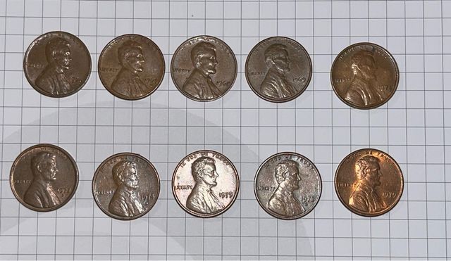 Conjunto de diez monedas de colección. - Monedas de diferentes años. - Diseño de Lincoln. - Ideal para coleccionistas.