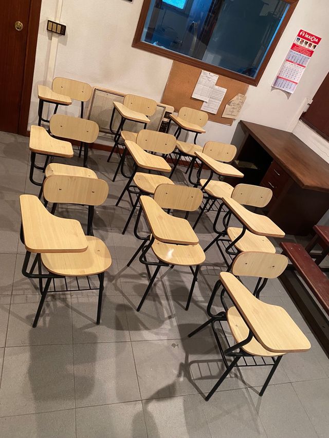 Detalles del productoConjunto de sillas de madera con mesa incluida, ideales para aula de colegio, autoescuela, clase de extraescolares, escuela de musica, academia, salas de estudio, biblioteca., etc. Contienen cajonera de rejilla metálica y pala (mesita). Son muy comodas y están como nuevas. Sirven para adultos o niños.