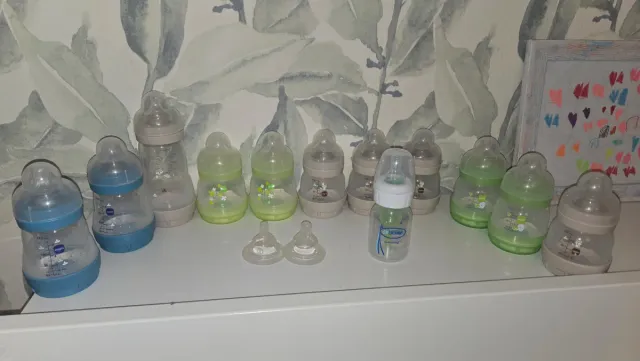 Detalles del productoConjunto de 11 biberones de la marca MAM, tres de ellos (los tres primeros de la derecha) son tetina número 0,el resto tentina número 1.