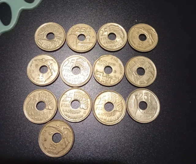 Detalles del productoConjunto de 13 monedas de 25 pesetas de España, con diferentes diseños y años.