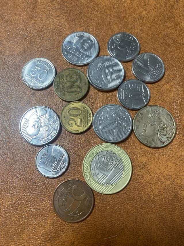 Conjunto de 14 monedas de Brasil. - Incluye monedas de diferentes valores y años. - Diseños variados con motivos brasileños.