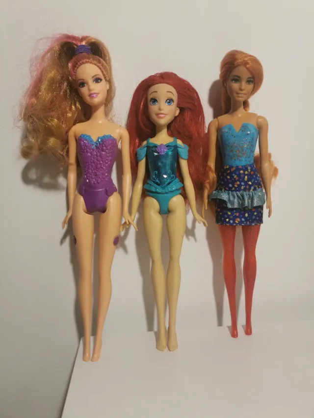 Se vende lote de tres muñecas. - Una Barbie con traje morado y detalles azules. - Muñeca Ariel con traje azul. - Otra Barbie con vestido azul y estampado de puntos.