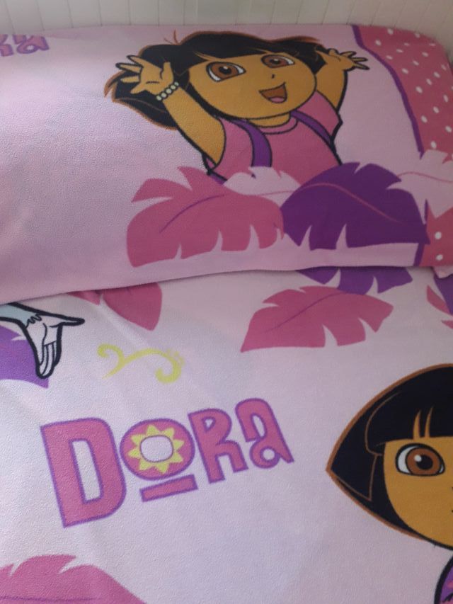 Detalles del productoLote compuesto por 2 fundas de microfibra polar para cama de 90 cm. Incluye las fundas para la almohada. Una es de Dora la exploradora y la otra es de princesas Disney. Se cierran con cremallera. Los tamaños son:
