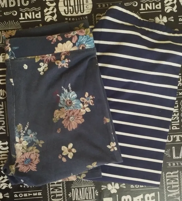Conjunto de dos mallas para niña, talla 11/12. - Una malla con estampado floral sobre fondo azul marino. - Otra malla de rayas verticales en azul marino y blanco.