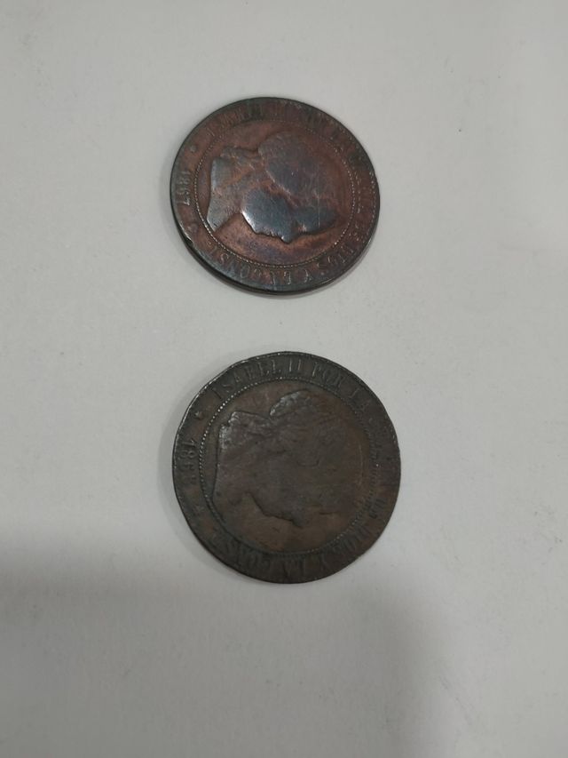 Se venden dos monedas de 5 céntimos de Isabel II, acuñadas en Barcelona. - Una moneda del año 1867. - Otra moneda del año 1868.