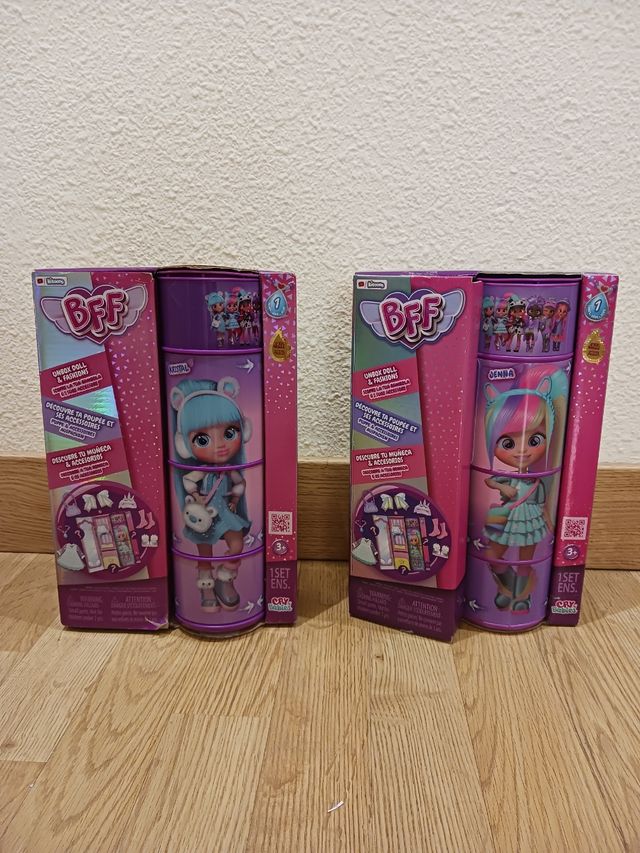 Detalles del productoSe venden dos muñecas BFF nuevas: el modelo KRISTAL y el modelo JENNA. Cada una viene con su conjunto de ropa y accesorios. Ideales para regalo. Cada muñeca viene en un estuche con forma de armario. Las muñecas son nuevas y están en perfecto estado.