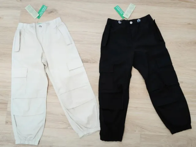 Lote de dos pantalones cargo de la marca Benneton para niño. Talla 7/8 años (130 cm). - Color beige. - Color negro. - Diseño cargo con múltiples bolsillos.