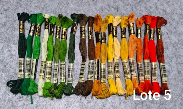 Conjunto de 20 madejas de hilo para bordar de la marca DMC, identificadas como Lote 5. - Hilo de bordar de alta calidad. - Variedad de colores disponibles.
