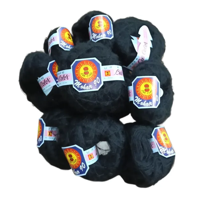 Se vende lote de 20 ovillos de lana Mohair negro. - Agujas recomendadas 3-4 - Composición: 90% Mohair, 10% Lana. - Cada ovillo tiene 25 gr y 131 yds (120 m).