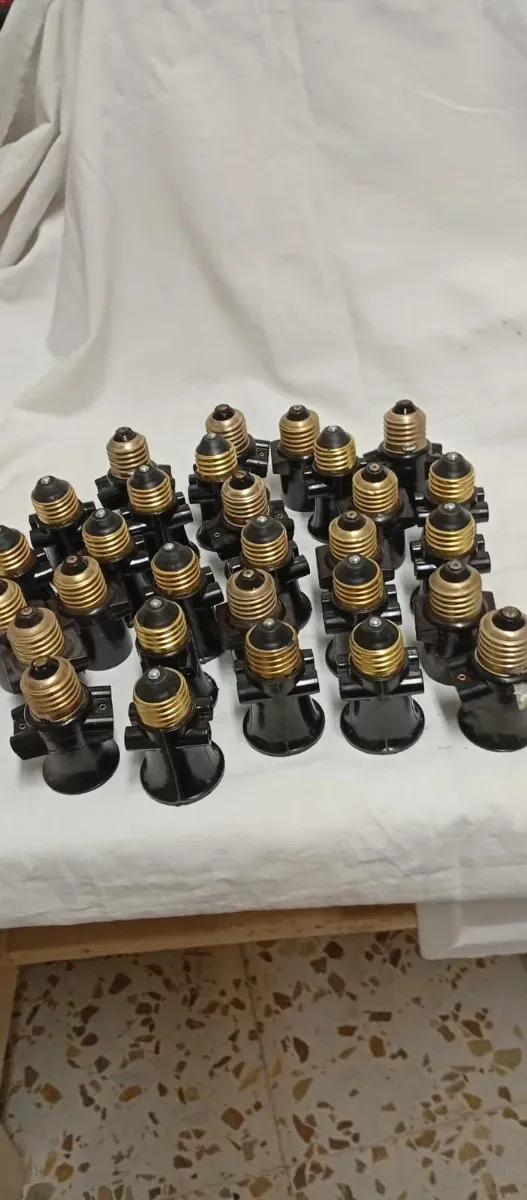 Gran lote de 29 casquillos de bombillas, para alumbrado en forma de rosario , tiene dos enchufes cada uno, 7,5 centímetros de alto, las partes metálicas, son de latón, nuevos sin estrenar, 35 euros todo el lote. R 1519.