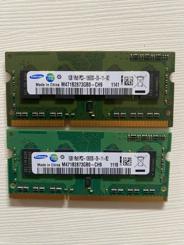 Conjunto de dos módulos de memoria RAM de 1GB cada uno. - Capacidad: 1GB por módulo. - Tipo: DDR3. - Velocidad: PC3-10600S. - Fabricante: Samsung.