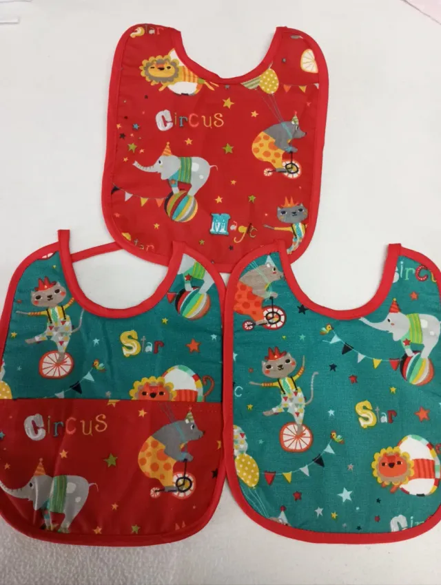 - Cada babero presenta un estampado único con animales y elementos circenses.