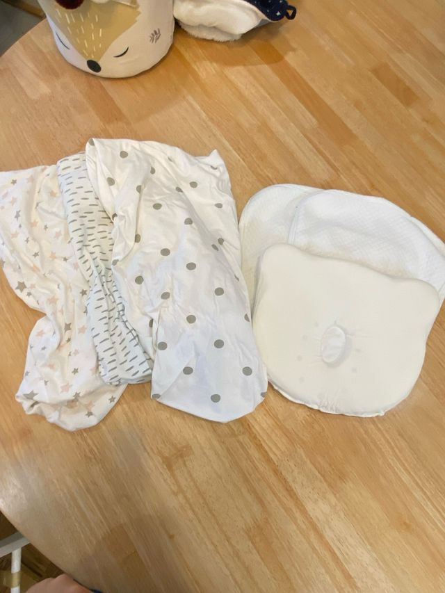 Conjunto de tres sábanas bajeras de cuna 100%algodón de 80x40cm y almohada para bebé de Homybaby con dos protectores. En muy buen estado