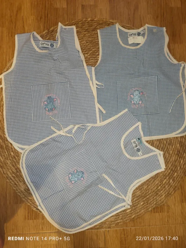Detalles del productoConjunto de tres batas o uniformes para guardería, con un alegre estampado de cuadros vichy en azul y blanco. Perfectas para el día a día en el colegio.