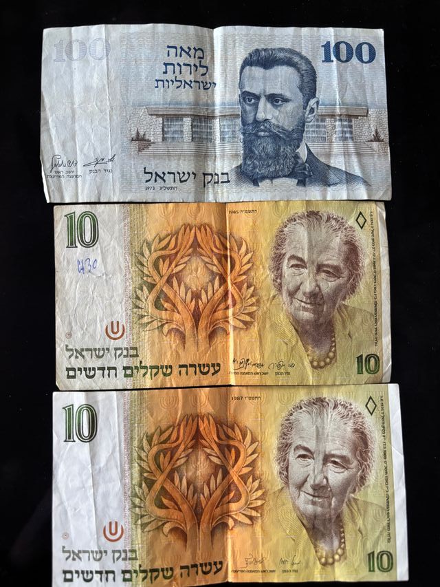 Lote de 3 billetes antiguos de Israel. Incluye billete de 100 liras de 1973 con Theodor Herzl y dos billetes de 10 New Sheqalim con retrato de Golda Meir. Piezas auténticas del Bank of Israel. Billetes circulados con marcas de uso y dobleces visibles (ver fotos). Interesantes para coleccionistas de numismática o billetes internacionales.
