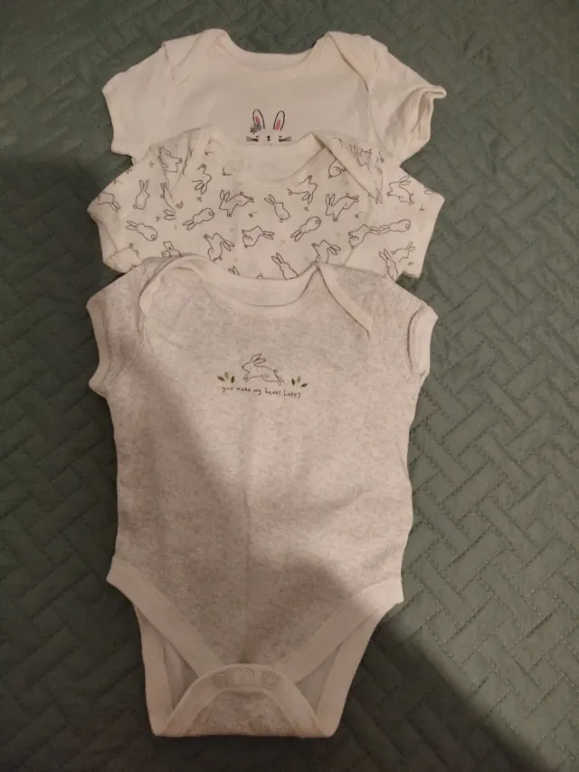 Detalles del productoConjunto de tres bodys de manga corta para bebé, talla 0-3 meses.