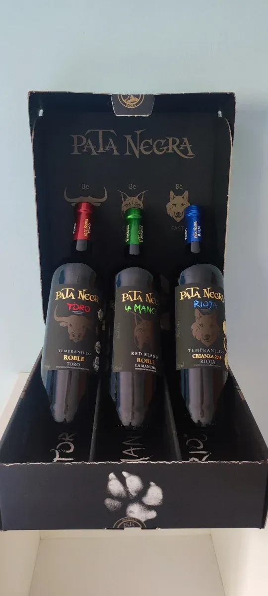 Detalles del productoPata Negra Estuche Fauna Ibérica de Vino con D.O. Rioja Crianza, Toro Roble y Mancha Roble, Sabor intenso y elegante con notas de frutos rojos y negros, especias y vainilla, 3 Botellas x 750. Ideal para disfrutar estas navidades o para regalar.