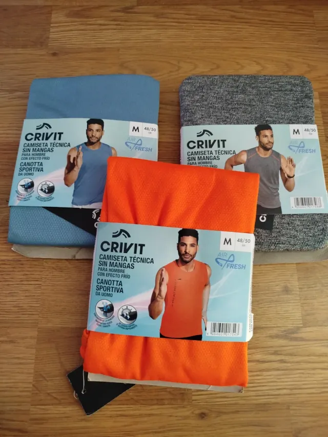 Conjunto de tres camisetas técnicas Crivit sin mangas para hombre, talla M. - Color azul - Color gris - Color naranja Nuevas sin estrenar Unidad suelta a 3€.