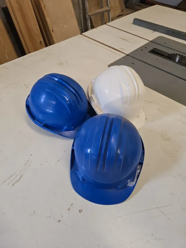Se vende lote de tres cascos de obra. Los 3 por 10 euros - Color azul y blanco. - Diseño con ventilación.
