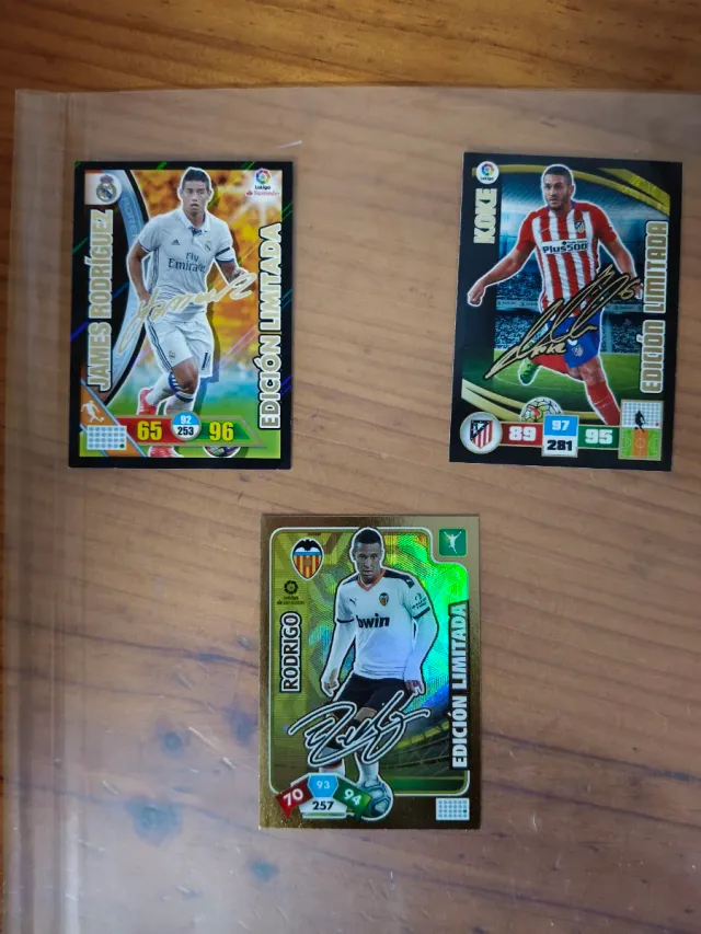 Lote de tres cromos de fútbol de edición limitada. - Cromo de James Rodríguez. - Cromo de Koke. - Cromo de Rodrigo.