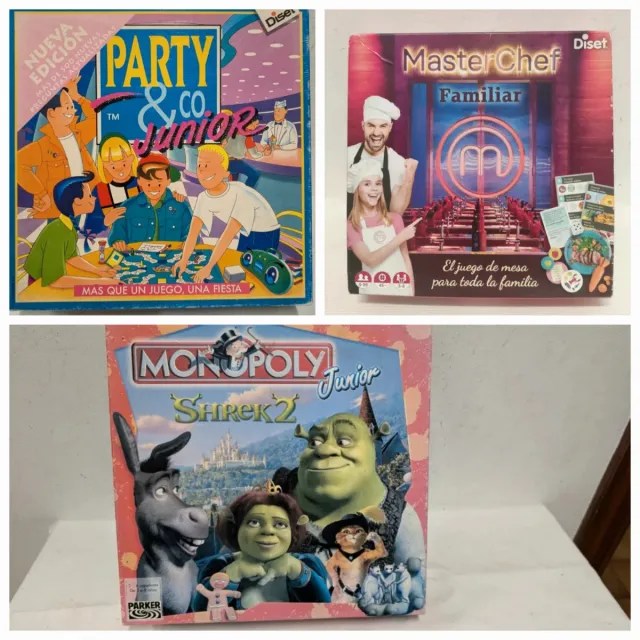 Se vende lote de tres juegos de mesa. - Party & Co Junior - MasterChef Familiar - Monopoly Junior Shrek 2