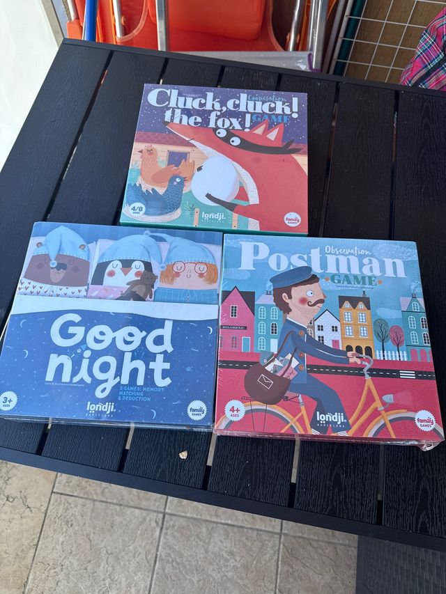 Conjunto de tres juegos de mesa de la marca Londji. - Cluck, cluck! The Fox! - Good night - Postman Observation Game