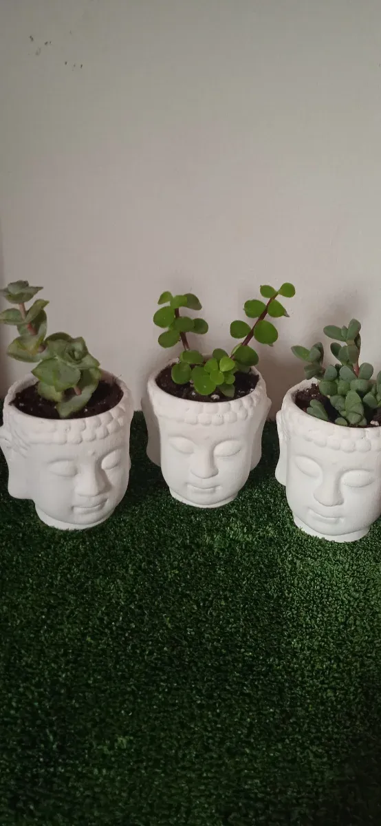 Conjunto de tres macetas decorativas con forma de cabeza de Buda, cada una con una suculenta. - Diseño de Buda. - Incluye suculentas. - Lote de 3 unidades.