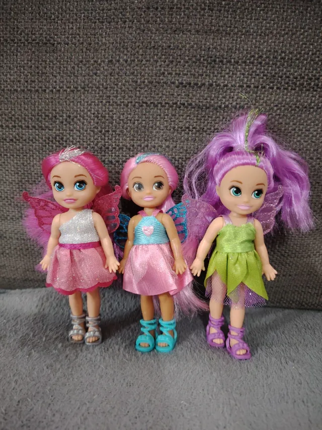 Detalles del productoConjunto de tres muñecas de hadas con alas y vestidos coloridos.