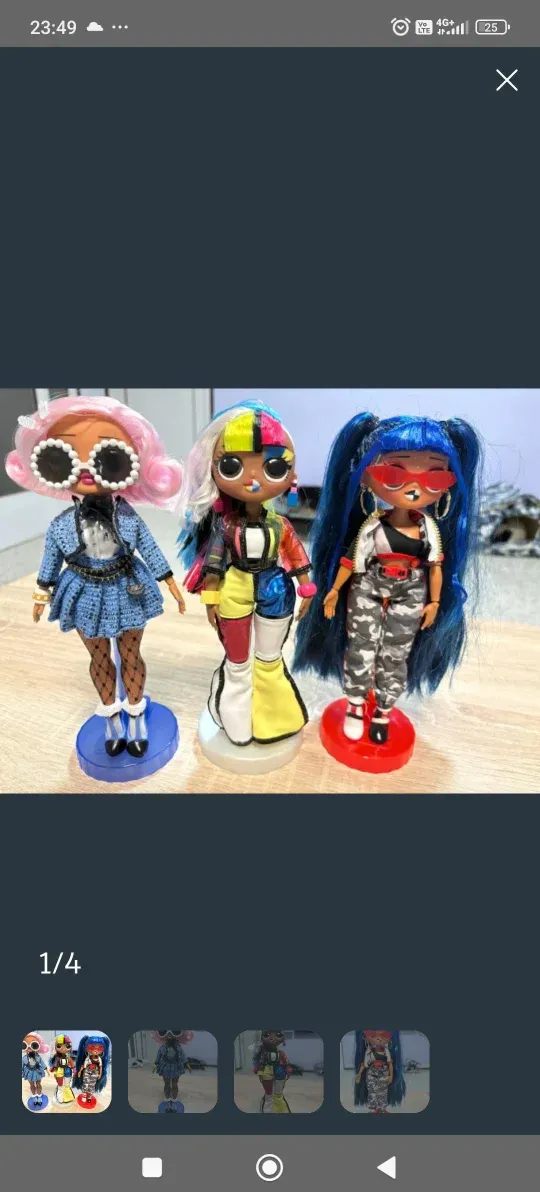 Lote de tres muñecas LOL. - Muñeca con pelo rosa y vestido azul. - Muñeca con pelo multicolor y traje de chaqueta. - Muñeca con pelo azul y pantalón camuflaje.