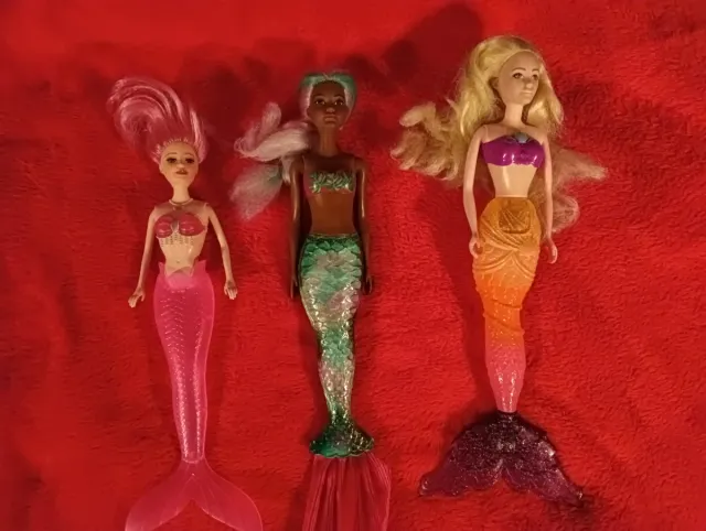 Detalles del productoConjunto de tres muñecas sirena con colas de colores.