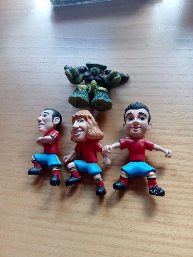 Detalles del productoSe venden cuatro figuras coleccionables: tres muñecos de jugadores de fútbol y un robot. Los muñecos son de plástico y presentan un diseño caricaturesco. El robot es de color verde. Son ideales para coleccionistas o aficionados al fútbol.