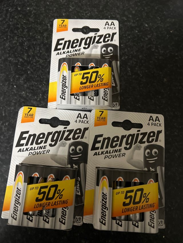 Se venden 3 paquetes de pilas Energizer AA. - Cada paquete contiene 4 pilas. - Tecnología Alkaline Power. - Larga duración hasta 50% más. - Vida útil de 7 años.