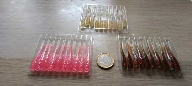 Detalles del productoConjunto de tres paquetes de señuelos para pesca.