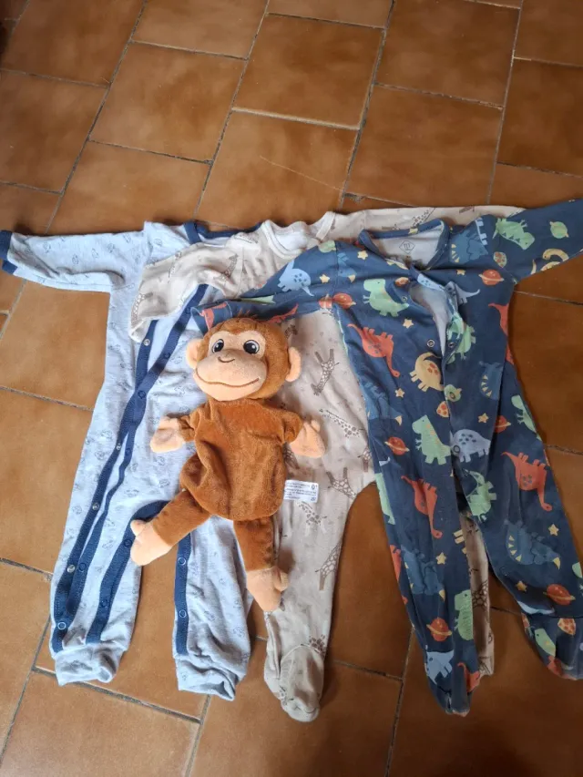 Detalles del productoConjunto de tres pijamas para bebé de 9 meses, junto con un peluche.