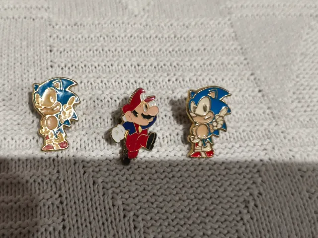 Conjunto de tres pines coleccionables. - Dos pines de Sonic. - Un pin de Mario.