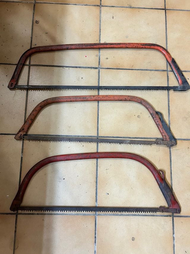 Detalles del productoConjunto de tres sierras de arco con mangos de color rojo y negro. Perfectas para trabajos de corte.