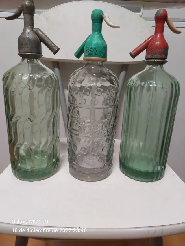 Detalles del productoConjunto de tres sifones antiguos de vidrio dos con dispensador de metalico échale un vistazo todo las fotos asta final lo de blanco un pequeño rata de abajo pero no afecta nada.