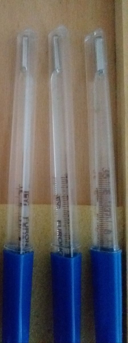 Conjunto de tres termómetros. - Cada termómetro tiene una funda protectora transparente. - Base azul. - Graduación visible en el cuerpo del termómetro.