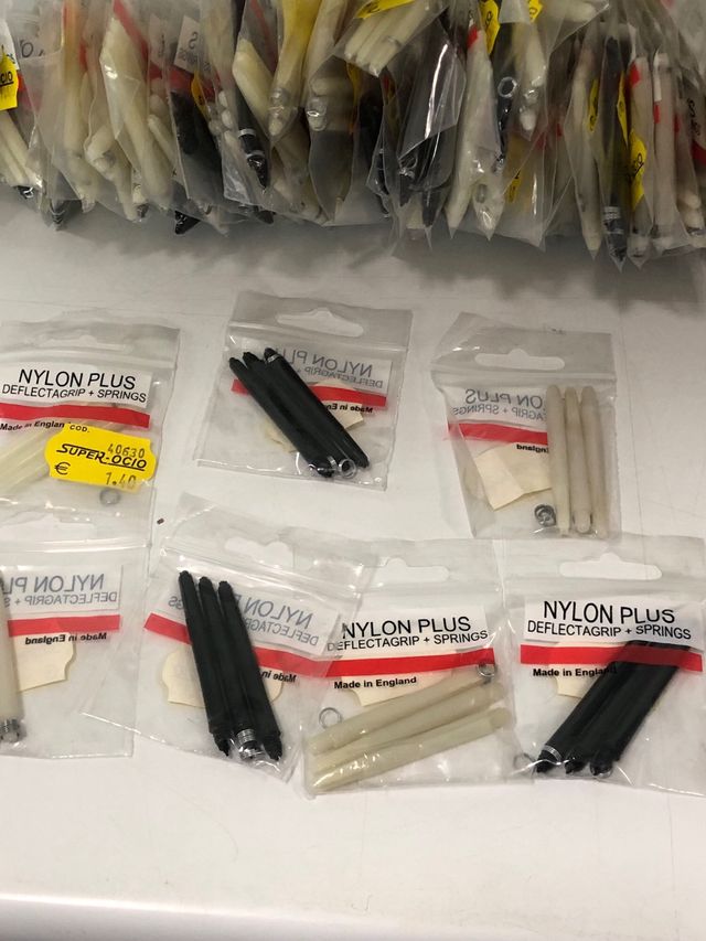 Detalles del productoConjunto de 339 cañas para dardos, cada una con una longitud de 5,5 cm. Son de la marca Nylon Plus Deflectagrip + Springs.
