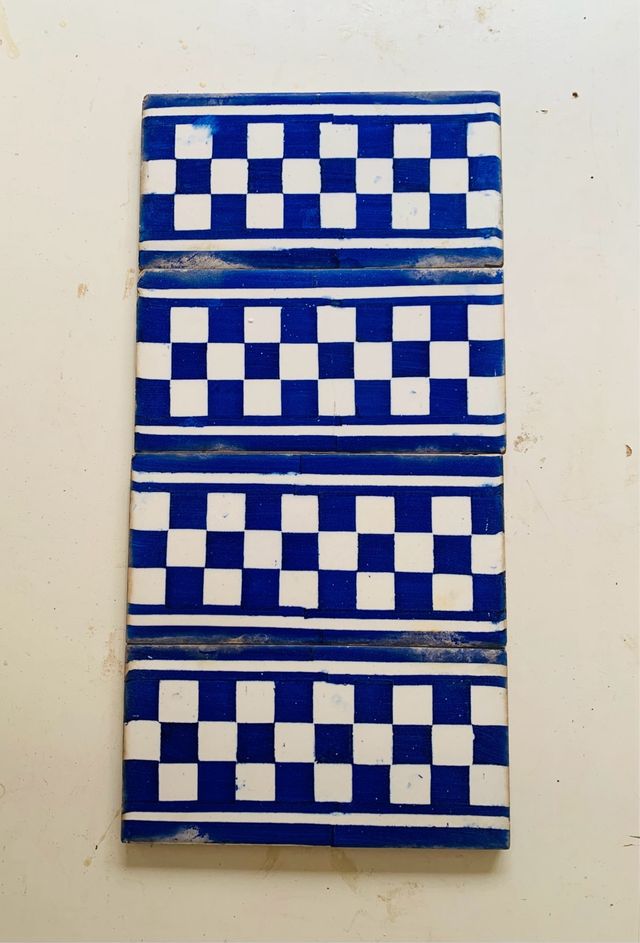 Detalles del productoConjunto de cuatro azulejos antiguos con un diseño clásico de damero en azul y blanco.