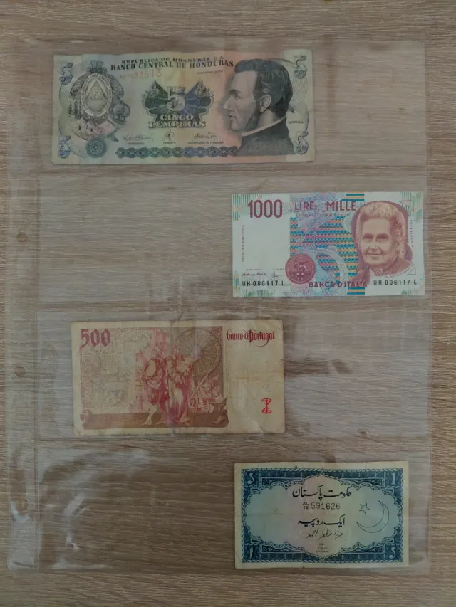 Italia 1.000 liras Maria Montessori, Portugal 500 escudos, Honduras 5 lempiras y Turquía 1 lira antigua con escritura otomana.