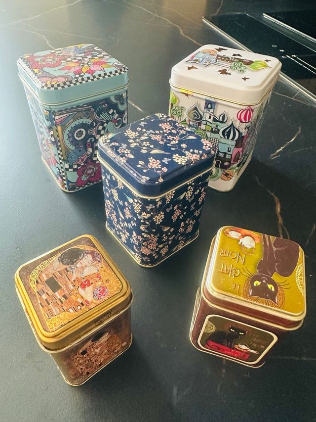 Detalles del productoConjunto de 5 latas metálicas con diseños variados para guardar tus infusiones