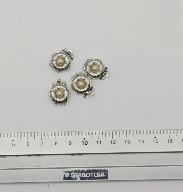 Detalles del productolote #34. 4 cierres de caja para 3 hilos, muy bonitos con forma de flor y perlita, metal plateado. Nuevos, funcionan perfectamente