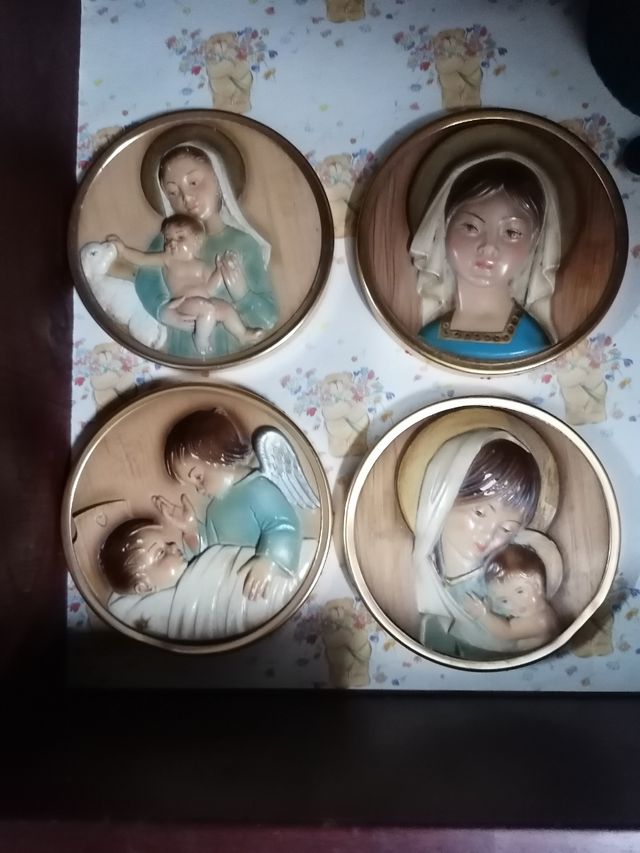 Detalles del productoConjunto de cuatro placas decorativas en relieve con motivos religiosos.